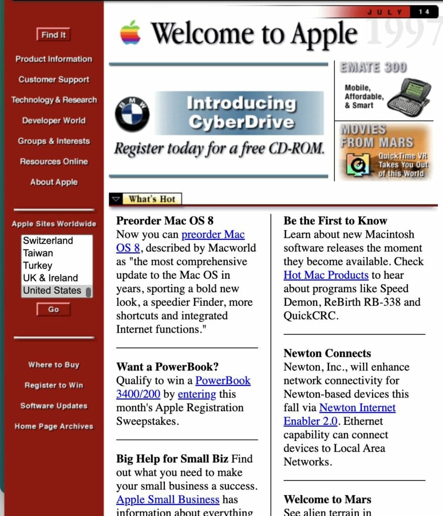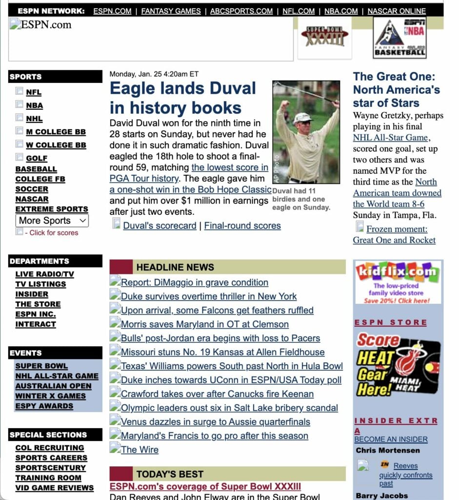 In the mid-1990s, websites were simple, static pages with limited visual elements and functionality. Text-based content dominated the screen, and the use of graphics was minimal due to slow internet speeds and limited bandwidth. Most web design looked something like what we see on the late-90s websites for Apple and ESPN (screenshots courtesy of the Wayback Machine):