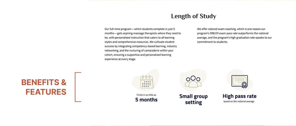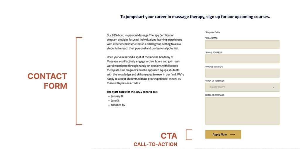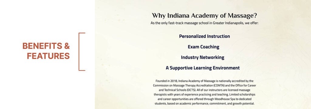 Amid short attention spans and intense competition, what strategic elements should your landing page employ to maximize its effectiveness? Let’s look at a recent landing page we made for our client, Indiana Academy of Massage, and examine the key components that turn casual browsers into engaged customers.
