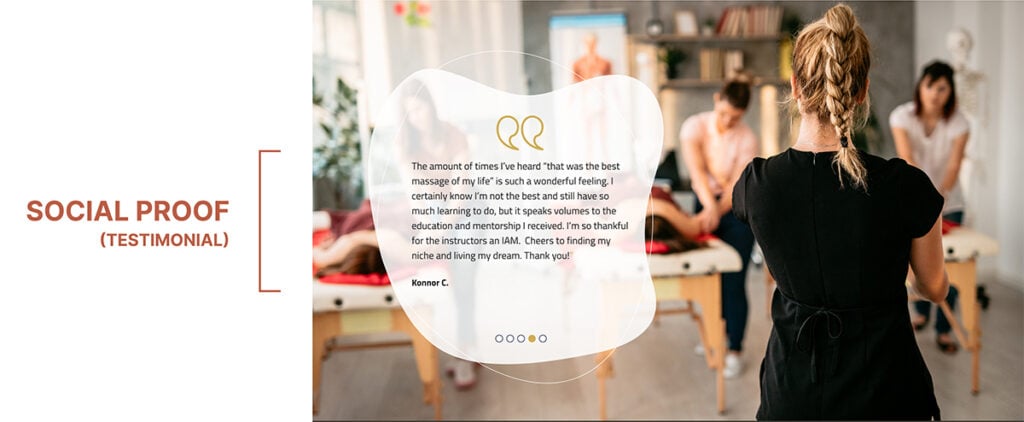 Incorporating testimonials, reviews, or certifications (sometimes called “trust badges”) is crucial for establishing social proof and bolstering credibility. Displaying positive experiences from past customers serves to reassure visitors about the reliability of your product or service. It’s essential to maintain the authenticity of the social proof and ensure its relevance to the specific offering, cultivating a sense of trust and confidence among potential customers. Here, a series of testimonials from past students allows interested parties to better understand what their own experience at the academy might be like.