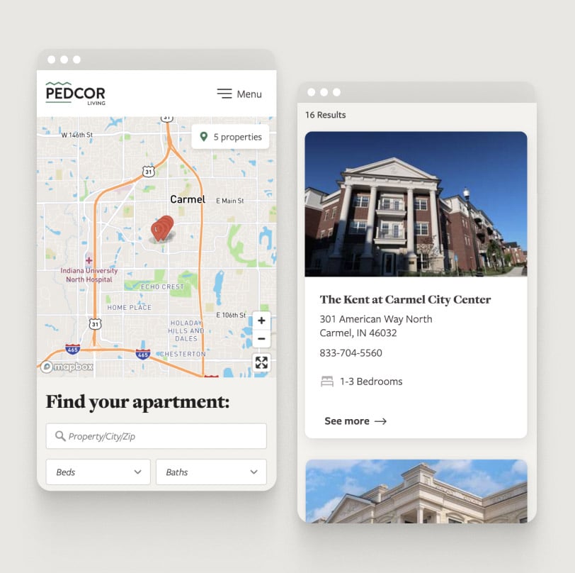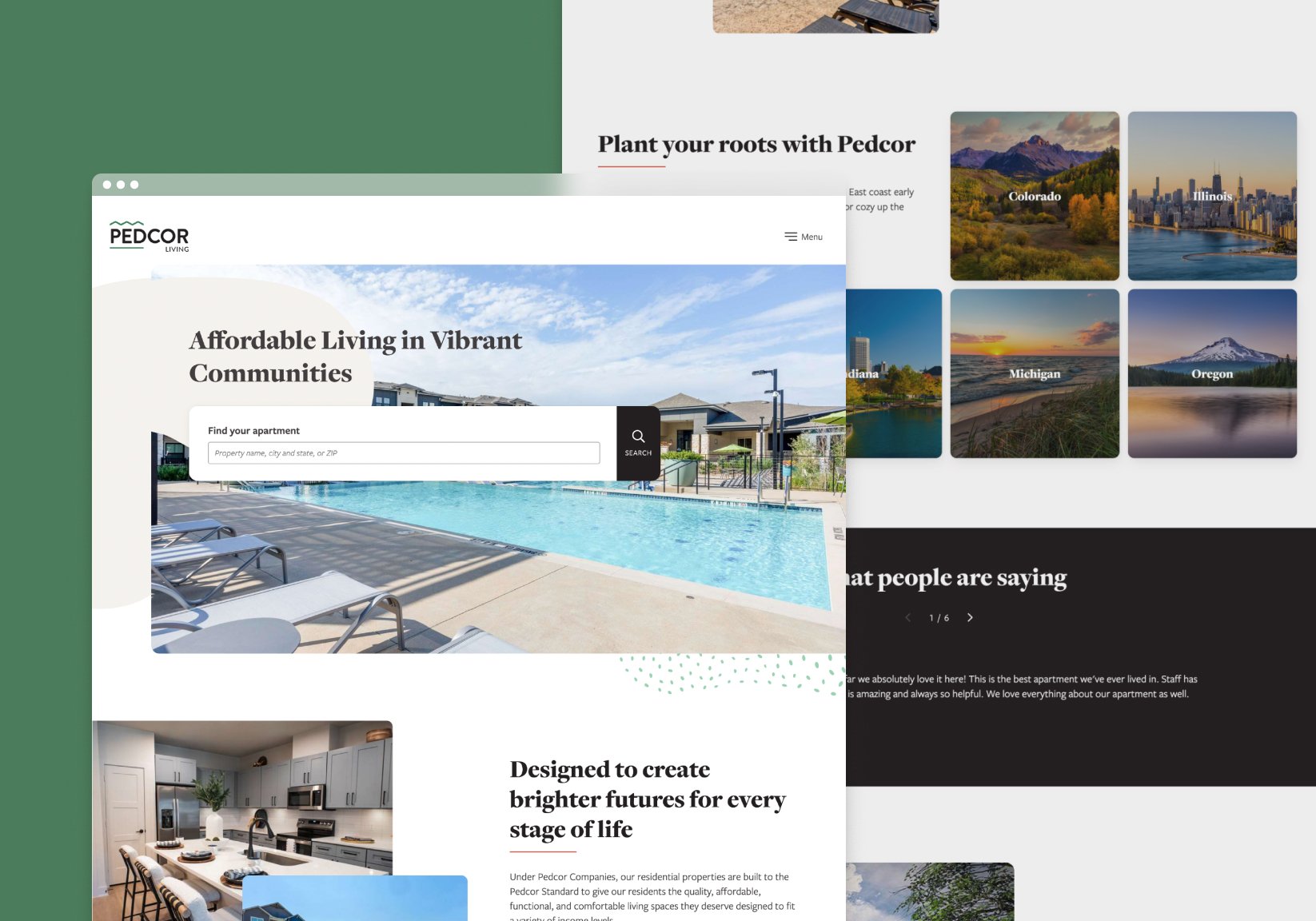 Our design strategy departed from typical apartment listing websites, instead focusing on the emotional journey of finding home. Photography featuring state-specific landscapes—Colorado mountains, Illinois plains, Indiana farmland—helps prospective residents envision their lifestyle in different geographic markets. The warm, inviting color palette and generous white space create a welcoming digital environment that mirrors the community atmosphere Pedcor Living properties provide.