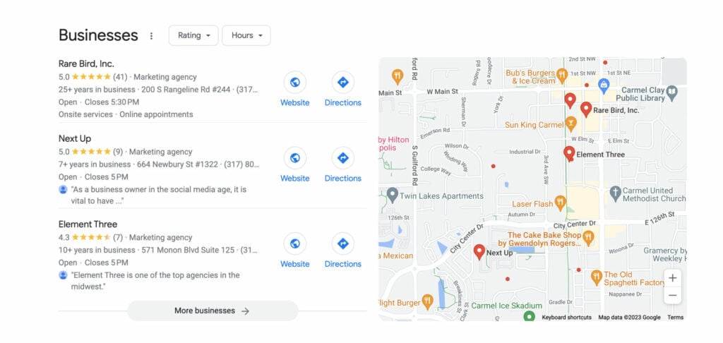 Let’s try this: I’ll search for “marketing near me carmel indiana.” After the four sponsored (read: paid) results, the first hit in the Businesses section is (ta-da!) Rare Bird, Inc., the Midwest’s most trusted modern marketing company.