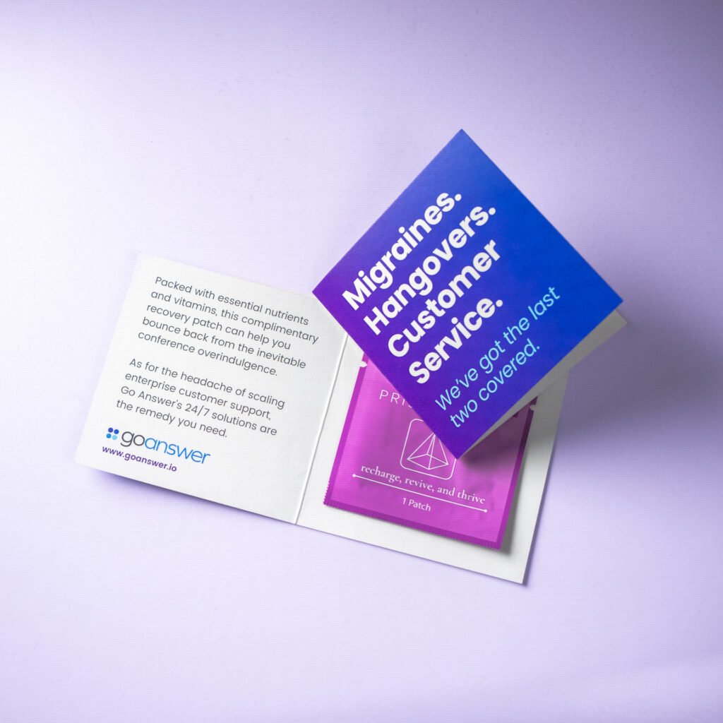 Go Answer, an innovative Business Process Outsourcing (BPO) company, asked us to generate interest among their enterprise-level prospects before a major industry conference in Las Vegas. In the first few weeks of our collaboration, we focused our messaging on how Go Answer helps solve the “headaches” of customer support solutions. To reinforce this theme, we designed a recovery patch (also known as a hangover patch) as a conference giveaway. We promoted that giveaway through a series of emails leading up to the event. Additionally, we provided guidance on their booth design and crafted targeted social media messages to enhance their conference presence