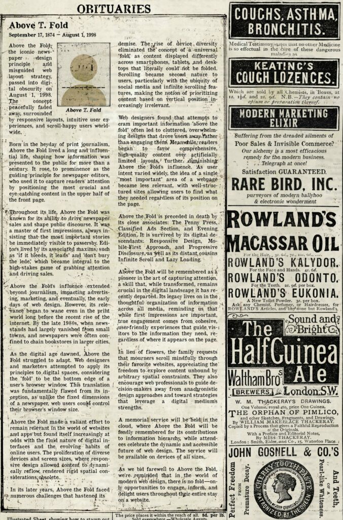 That’s when I saw it—an obituary that made me stop the scrolling screen. I leaned in closer and adjusted the focus knob. The obit chronicled how Above the Fold, a once-essential concept regarding the physical placement of stories above the literal fold in a newspaper, had finally passed on. The term originated from the way broadsheet newspapers were displayed at newsstands, folded in half horizontally. Any story placed above this fold line was prime territory, guaranteed to catch readers’ eyes.