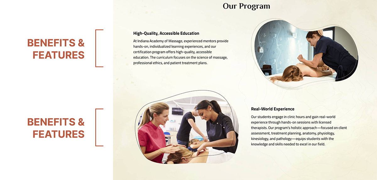 If you’d like us to put these ideas to work for a landing page of your own, reach out and say so! If you’re considering a career change, though, and think massage therapy might be right for you, Indiana Academy of Massage is the way to go.