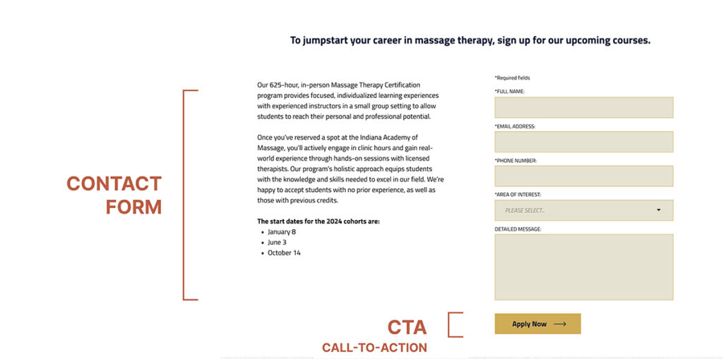 Amid short attention spans and intense competition, what strategic elements should your landing page employ to maximize its effectiveness? Let’s look at a recent landing page we made for our client, Indiana Academy of Massage, and examine the key components that turn casual browsers into engaged customers.