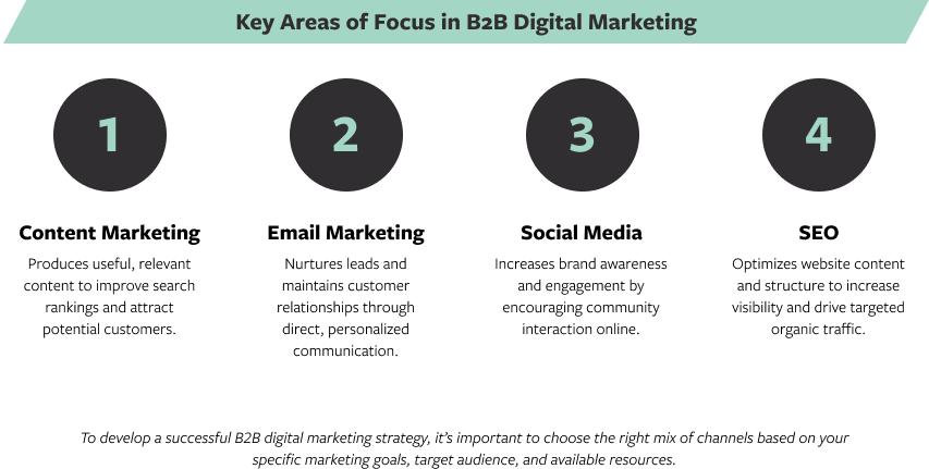 To create a successful B2B digital marketing strategy, you must understand the various channels available and how they can be leveraged to reach and engage your target audience. Four key areas of focus in B2B digital marketing—content marketing, email marketing, social media, and search engine optimization (SEO)—can help you develop a strong presence across these channels and craft an approach that addresses the unique needs of your B2B audience. If you can do that, you can effectively drive brand awareness, generate leads, and support your overall marketing goals.