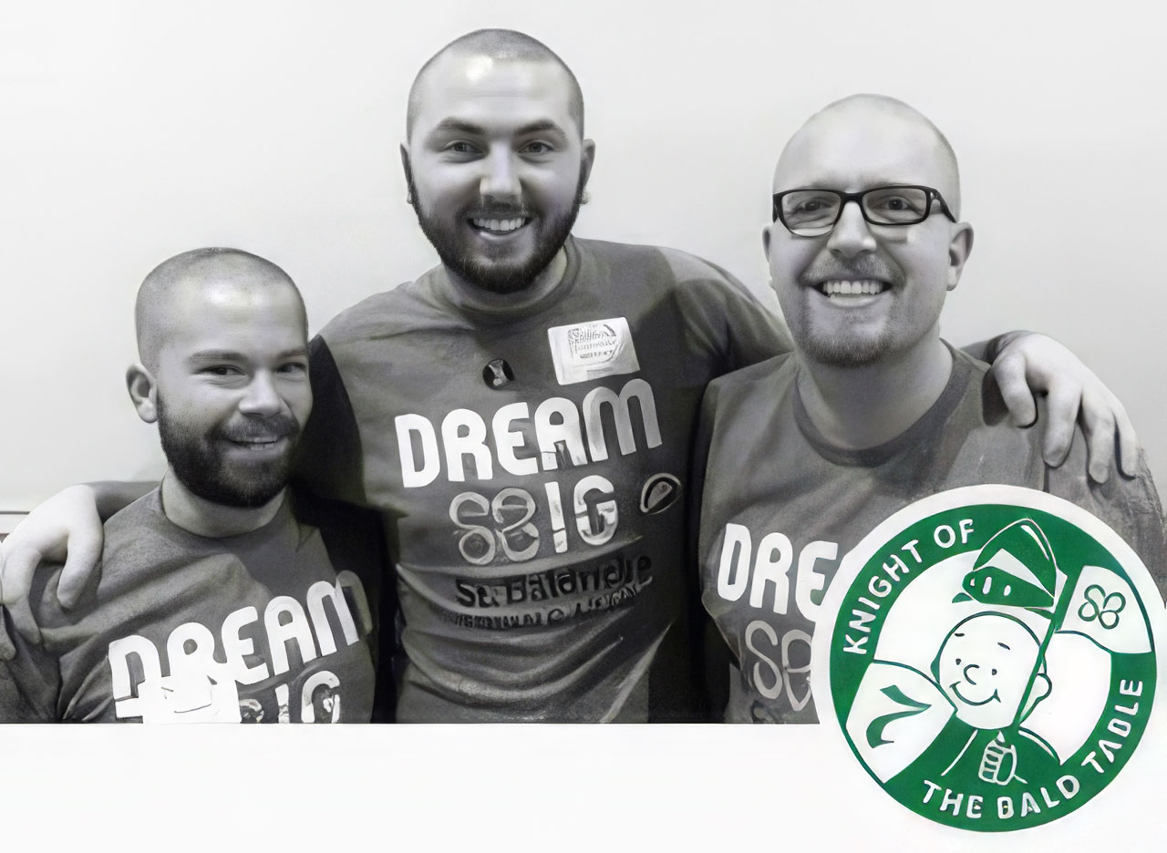 Note that we’ve decided to make shaving our heads for St. Baldrick’s part of our 20th Anniversary “Good Deeds & Good Times” celebration at the suggestion of Brad Meiser. Brad (above, left) has long been a part of the flock and has been a faithful St. Baldrick’s shavee for nearly as long. In fact, Brad has earned the distinction of becoming a Knight of the Bald Table for his seven-year participation. We’ve supported Brad’s efforts over the years and couldn’t say no when he asked us to join the ranks of the newly shorn. All of us are excited to follow in his barber chair for this great cause!