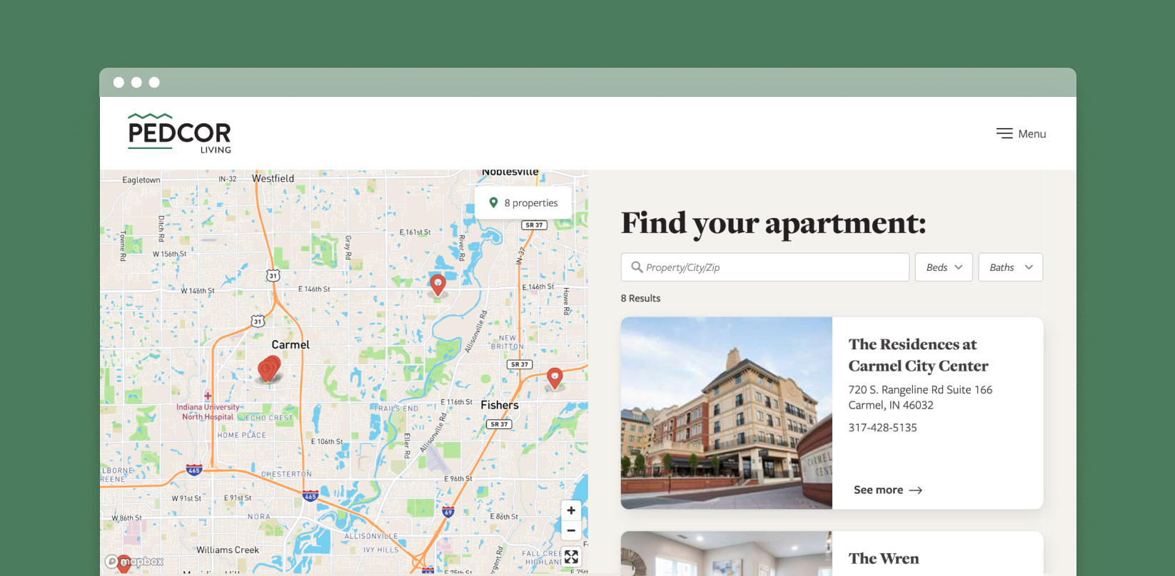 Our design strategy departed from typical apartment listing websites, instead focusing on the emotional journey of finding home. Photography featuring state-specific landscapes—Colorado mountains, Illinois plains, Indiana farmland—helps prospective residents envision their lifestyle in different geographic markets. The warm, inviting color palette and generous white space create a welcoming digital environment that mirrors the community atmosphere Pedcor Living properties provide.