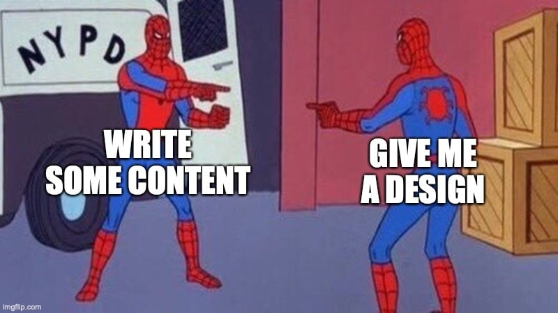 For that reason, Ashley wrote me on the day this post was scheduled to be published to ask if I had written any copy she could read before helping figure out what images we might use. She did have one idea—back in January, I shared a meme I’d made with her and another designer, Alysia Legler. I originally had the idea for the meme not long after starting at Rare Bird, but I didn’t share it right away. I was still trying to understand the process of working alongside four different designers, each of whom is talented in complex and unique ways. They are not a monolith, as they exemplify the range of collaborative options and individual tendencies explored in this article.